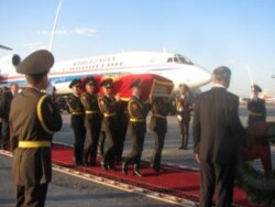 Мына ушундай сөздөрдөн кийин маркумдун сөөгү Алатоо аянтына алып келинип, ал жерде мамлекеттик туу ылдый түшүрүлдү. Миңдеген адамдар минута эскерүү жасап, мамлекеттин гимни ойнолду. Бул учурда өкмөт үйү баш болгон мамлекеттик имараттарда мамлекеттик туу аза күтүп, жер карай желбиреп турду.
