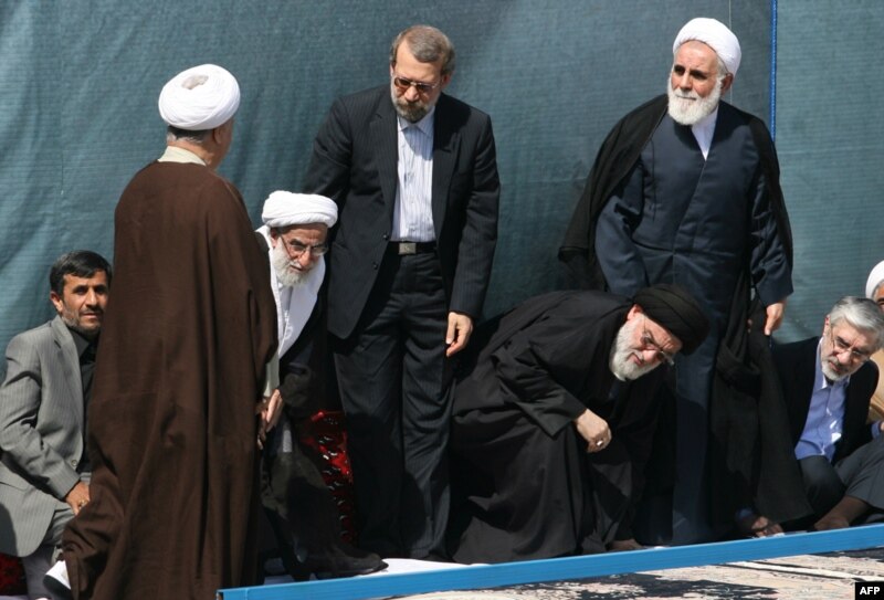 Ирандын саясый элитасы. Солдон оңго: президент Ахмединежад, экс-президент Рафсанжани, Күзөтчүлөр кеңешинин төрагасы Жанати, парламент төрагасы Ларижани, Жогорку соттун төрагасы Шахруди, экс-спикер Нури, мурдакы премьер-министр Мусави. Булар азыр эки жаатта.
