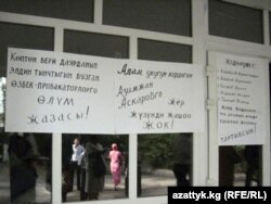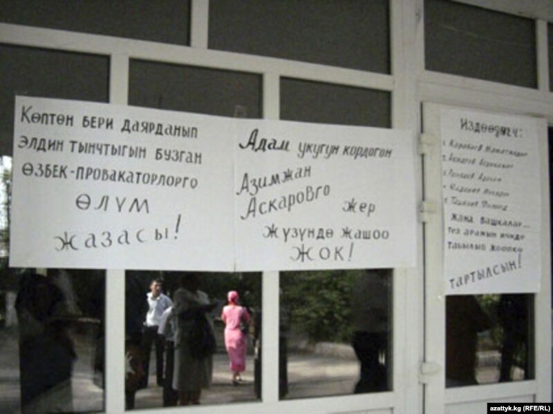 Сот өтүп жаткан имараттын кире бериш чендеги дубалдарга 13-июнда Ош- Бишкек жолунун боюнда мыкаачылык менен өлтүрүлгөн милициянын майору М. Сулаймановдун туугандары анын өлүмүнө себепкер болгон адамдарга эң жогорку жаза берүүнү талап кылган плакаттарды илип коюшту. Анын атасы Жусуп Сулайманов соттон баласына кол салгандарга мамлекеттик кылмышкер катары баа берүүнү өтүндү: