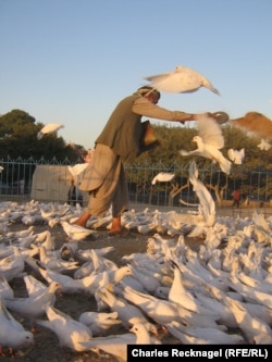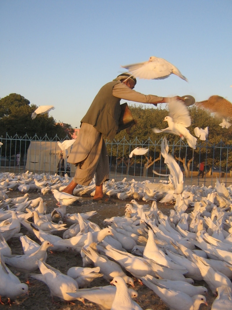 Көк Мечиттеги кептерлердин камын көргөн адам. Мазари Шариф.