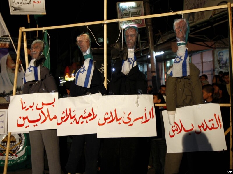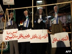 ХАМАСтын жактоочулары Израилдин желектери мойнуна илинген Палестин лидерлеринин дарга асылган кебинин жанында турушат. Акция исламчыл "Рафа" кыймылы тарабынан уюштурулган. Газа. 26-январь, 2011