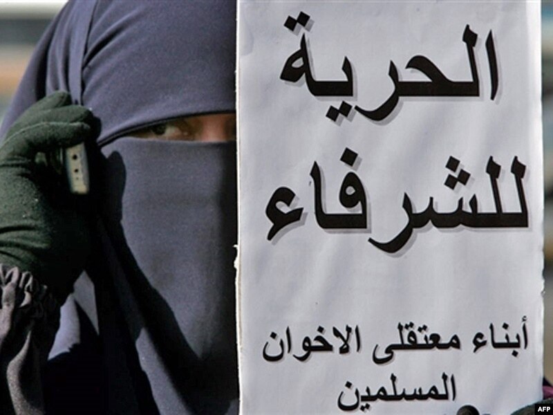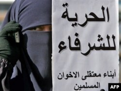 Египеттик аял "Мусулман агайындар" уюмунун абакта отурган балдары жазган "Сый-урматтуу адамдар үчүн эркиндик" деген ураанды кармап турат. Каир. 28-февраль 200