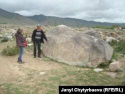 Буранада гид чет элдик туристке чегилген ташты көрсөтүүдө