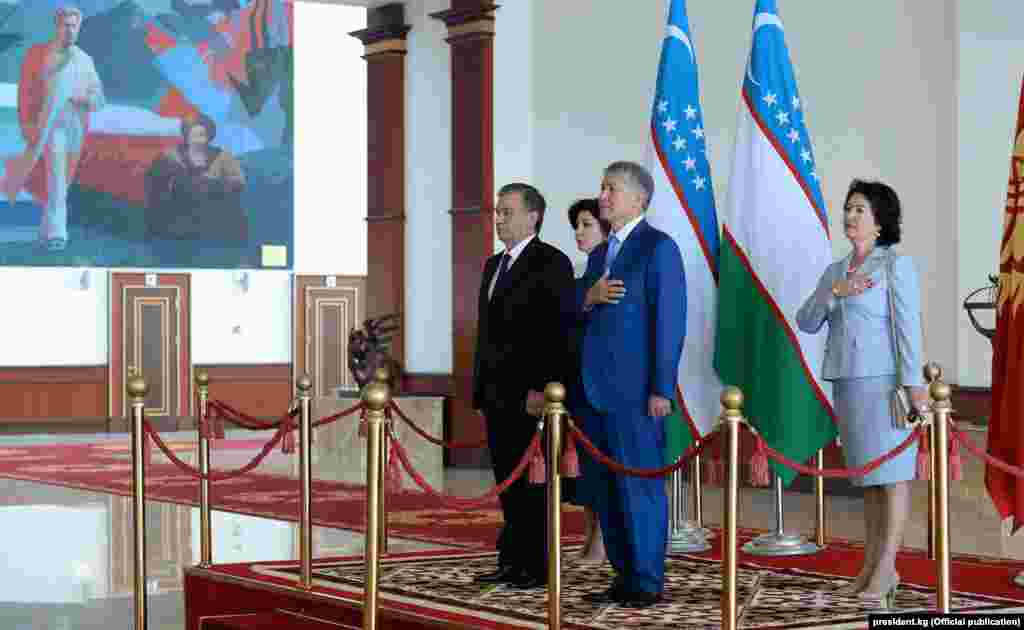 "Манас" аба майданынан Улуттук гвардиянын ардак кароолунун коштоосунда өзбек президенти жана анын жубайы Зироатхан Мирзиёеваны кыргыз лидери жубайы Раиса Атамбаева менен бирге тосуп алышты.