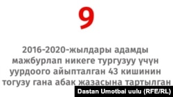2016-жылдан 2020-жылга чейин сотко жеткен 43 ишти изилдеп чыгып, алардын ичинен тогуз айыпталуучу гана абак жазасына тартылганын аныктадык. Алар жарым жылдан беш жылга чейин эркинен ажыратылган.