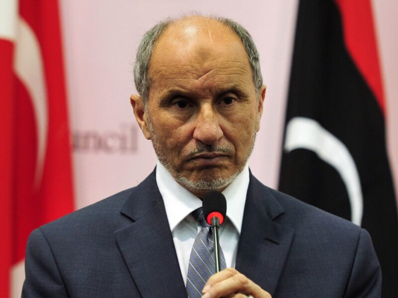 Эрегишчилердин Улуттук өткөөл кеңешинин төрагасы Мустафа Абдел Жалил Түркиянын тышкы иштер министри Ахмет Даудоглу(ал сүрөттө жок) менен Бенгазидеги пресс-конференцияда. 23-август.