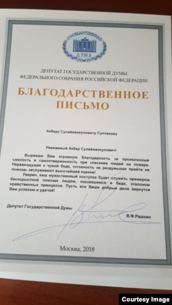 Адам өмүрүн сактоодо көрсөткөн эрдиги үчүн Акбар Султановго Орусиянын Мамдумасынын депутаты Валерий Рашкин ыраазычылык катын ыйгарган.